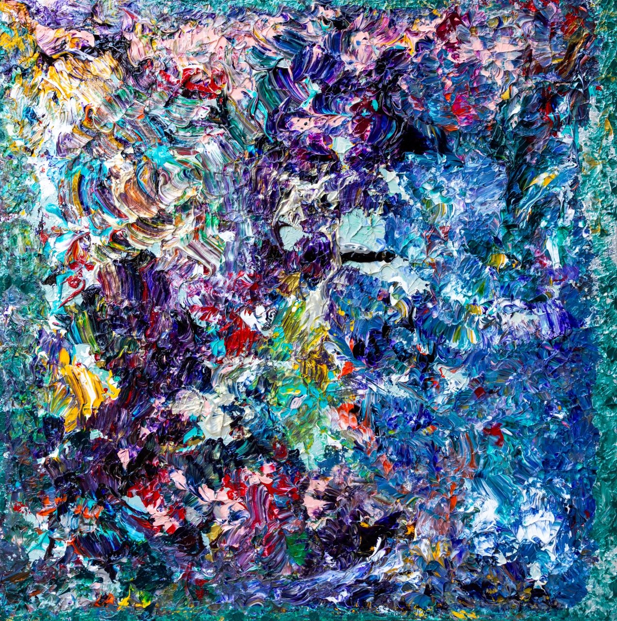 Working across multiple canvases in a single flow, she pours and layers paint directly onto the surface, building textured compositions that balance spontaneity with intention. Each piece is completed individually, allowing distinct rhythms to emerge. Her brushstrokes move in shifting directions, activating the canvas and inviting the viewer into a heightened, emotional space — a crescendo where feeling leads, and meaning follows.